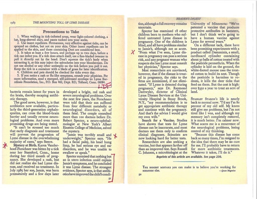 Little did Karen and Tom realize that they were at the tip of the iceberg of worldwide cases because in 2022, Dong, et al published a meta-analysis proving that 14.5% of the world’s population (1.144 billion people) were infected with Lyme disease! That does not take into account the 36% of cases that never seroconverted to a positive test. In Vaccination against LD with Recombinant Bb etc., Steere et al. proved, and SmithKline confirmed, that 36% of culture positive patients remained seronegative throughout the life of their disease. However, those patients were not counted in the 14.5%.