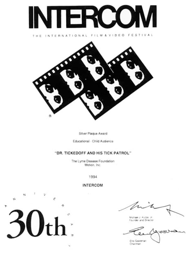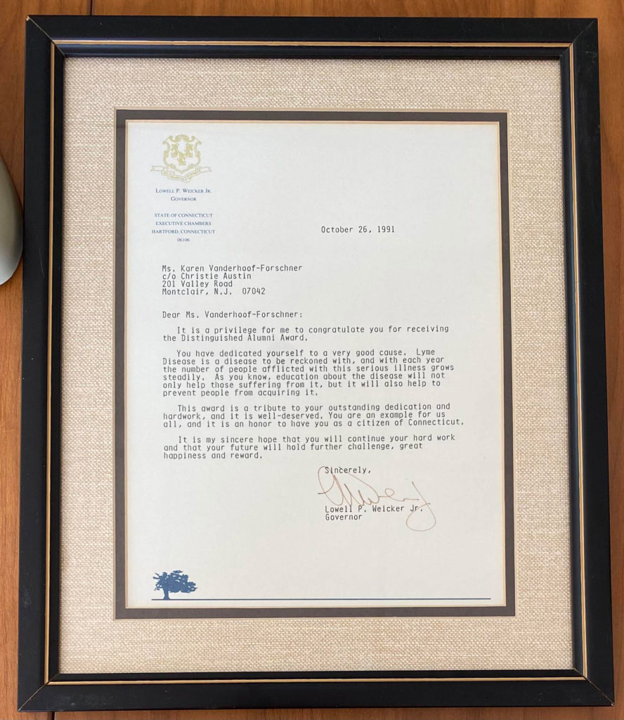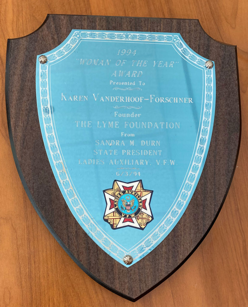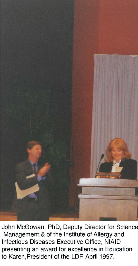 The Lyme Disease Foundation was honored in 1997 for its exceptional scientific educational programs, its awareness programs (which made “Lyme disease” a household term), and its sense of civic responsibility. The award was presented to Karen Vanderhoof-Forschner at the National Institutes of Health, during NIH’s hosting the LDF’s 1997 Annual Scientific Conference at their auditorium.