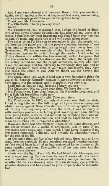 Ms. Forschner. You mentioned that I chair the board of directors of the Lyme Disease Foundation, but after all my years of a career, I find that my most important role that I have ever had was as Jamie's mom, and that's the role I will speak about today.