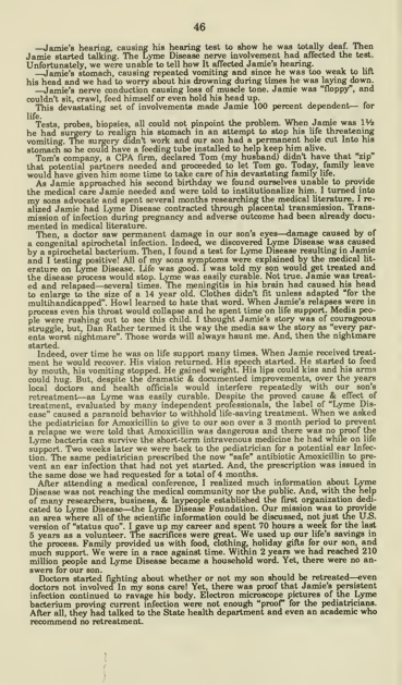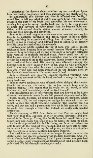 As Jamie approached his second birthday we found ourselves unable to provide the medical care Jamie needed and were told to institutionalize him. I turned into my sons advocate and spent several months researching the medical literature. I re- alized Jamie had Lyme Disease contracted through placental transmission. Trans- mission of infection during pregnancy and adverse outcome had been already docu- mented in medical literature. —damage caused by of