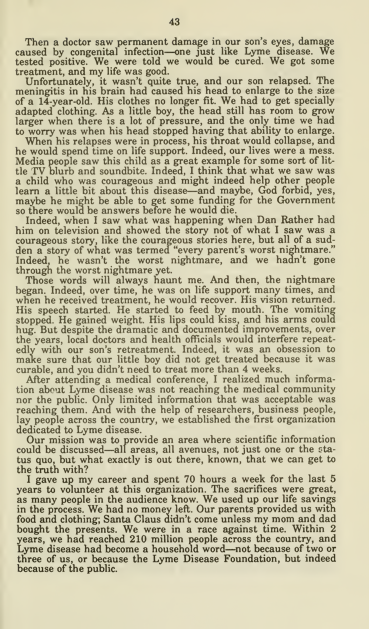 After attending a medical conference, I realized much information about Lyme Disease was not reaching the medical community nor the public. And, with the help of many researchers, business, & laypeople established the first organization dedi- cated to Lyme Disease—the Lyme Disease Foundation. Our mission was to provide an area where all of the scientific information could be discussed, not iust the U.S. version of "status quo". Igave up my career and spent 70 hours a week for the last 5 years as a volunteer. The sacrifices were great. We used up our life's savings in the process. Family provided us with food, clothing, holiday gifts for our son, and much support. We were in a race against time. Within 2 years we had reached 210 million people and Lyme Disease became a household word. Yet, there were no an- swers for our son.