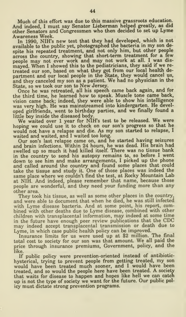 In 1990, NIH's new test that they had developed, which is not available to the public yet, photographed the bacteria in my son despite his repeated treatment, and not only him, but other people across the country, showing that short-term treatment for a few people may not ever work and may not work at all. I was dismayed. When I showed this to the pediatricians, they said if we retreated our son, based on what they got from our local health department and our local people in the State, they would cancel us, and they canceled my son as a patient. We had no physician in the State, so we took our son to New Jersey.