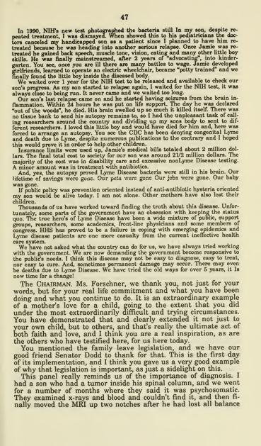 Our son's last relapse came on and he started having seizures from the brain in- flammation. Within 24 hours he was put on life support. The day he was declared "out of the woods", he died. His brain swelled up so much it killed itself. There was no tissue bank to send his autopsy remains to, so I had the unpleasant task of call- ing researchers around the country and dividing up my sons body to sent to dif- ferent researchers. I loved this little boy and would have died for him and, here was forced to arrange an autopsy. You see the CDC has been denying congenital Lyme and death due to Lyme, despite numerous publications to the contrary and I hoped this would prove it in order to help other children.
